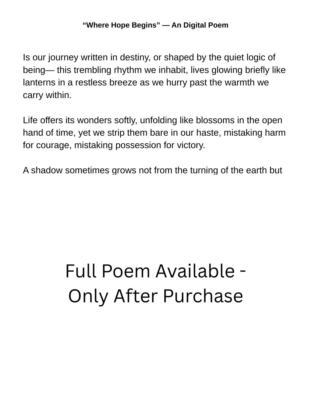 “Where Hope Begins” is a simple 2‑in‑1 digital poem and poster that highlights the moment when hope first takes shape. It pairs a brief, uplifting poem with a clean visual design to create a compact, inspiring reminder of new beginnings