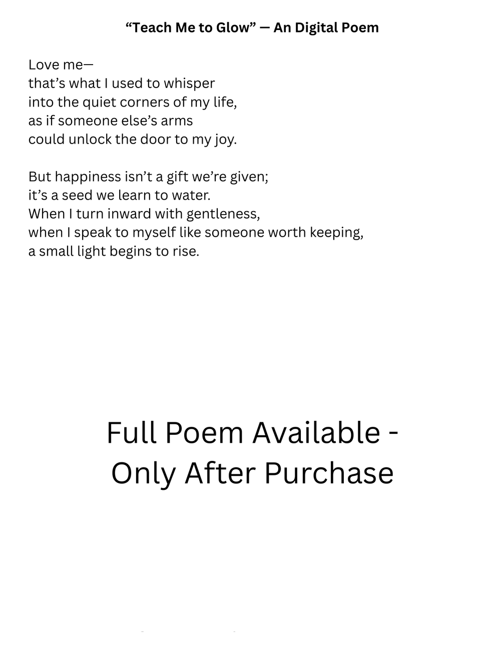 “Teach Me to Glow” is a beautifully crafted digital poem paired with a modern, gallery‑style poster layout—perfect for anyone who loves meaningful décor with emotional depth. This 2‑in‑1 piece combines expressive writing with elegant visual design, creating a keepsake that speaks to the heart and brightens the room.